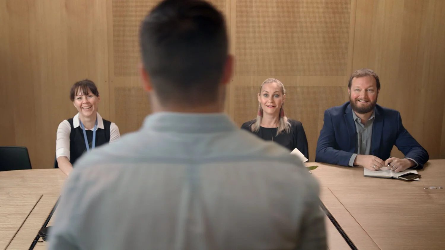 The opening shot begins with our main talent walking in to show the back of his head and his audience’s reaction. This was done in a bid to not give everything away and introduce the important and humourous reveal. Colour, depth and separation were difficult factors on the shoot as we had no control over the location. We were in a small meeting room with a large table that was the same colour as the wall and we were unable to move. We favourited our cleanest wall for our main talent using blocking to hide the many wall controls and switches behind him. We then created some depth with the use of peoples shoulders, props in the form of glasses, a plant and a whiteboard, and set the camera height to show the table as an additional layer of depth and create a subtle empowering feeling looking up at our talent as he fully embraces the meeting with the mouthpiece giving it his best. Our reverse shot was slightly more challenging as the table, wall and skin tones were all very similar colours and physically close to each other. Fortunately, we had some fast lenses which helped soften the background, we then again used props to add a foreground layer of depth, and created a top light for our talent to bring them out from the back wall which we flagged in order to let the wall fall darker.
